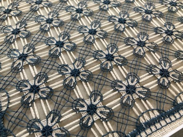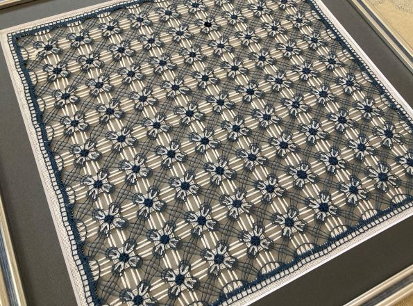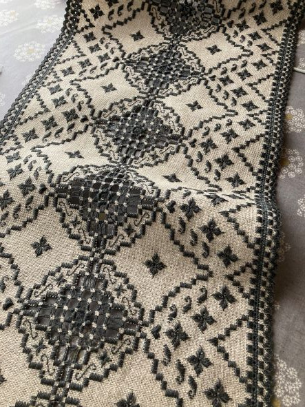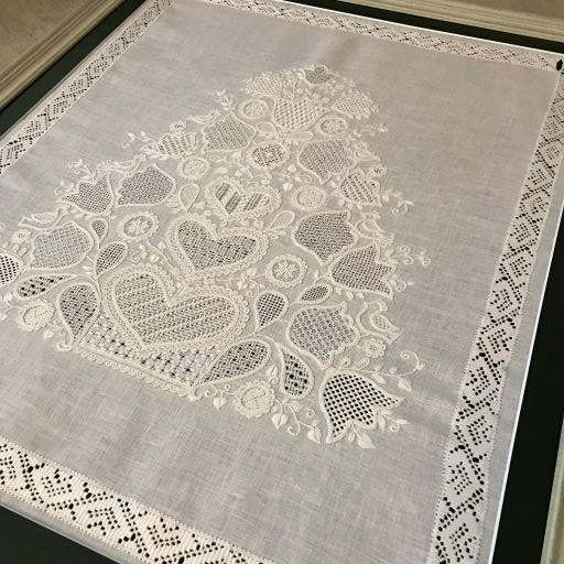 周りのドロンワークのダーニングが重厚感を加え素晴らしい作品が出来上がりました。