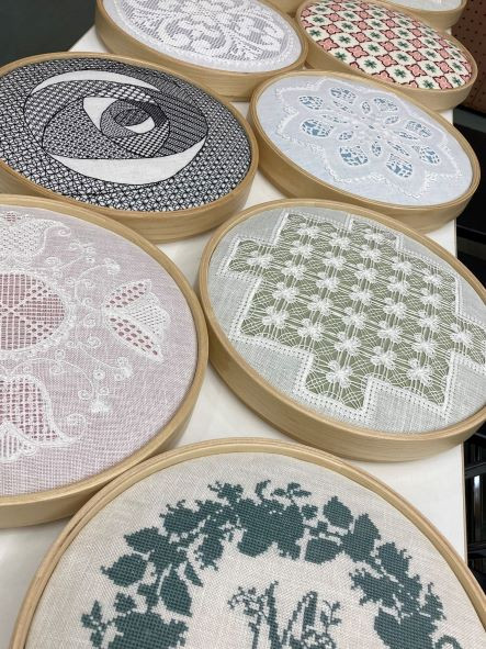 穴がいっぱい開いて均等に引っ張る作品は刺繍枠は周囲から最初から最後まで