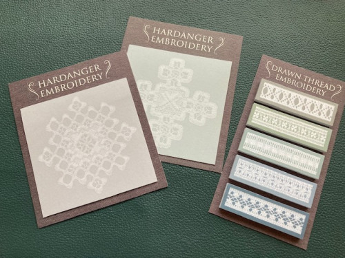 付箋は7㎝正方のハーダンガー透かしが2種類と5種のドロンワークセットが1種類