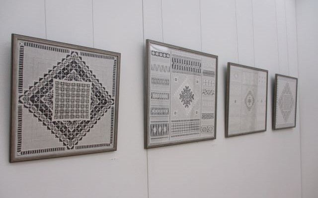 白い壁面に白い作品は目立ちませんのでいつも濃い色をバックに入れます。 中のステッチもくっきりとしてご覧いただけたでしょうか。 周囲はとんでもない数のアジュールが・・・