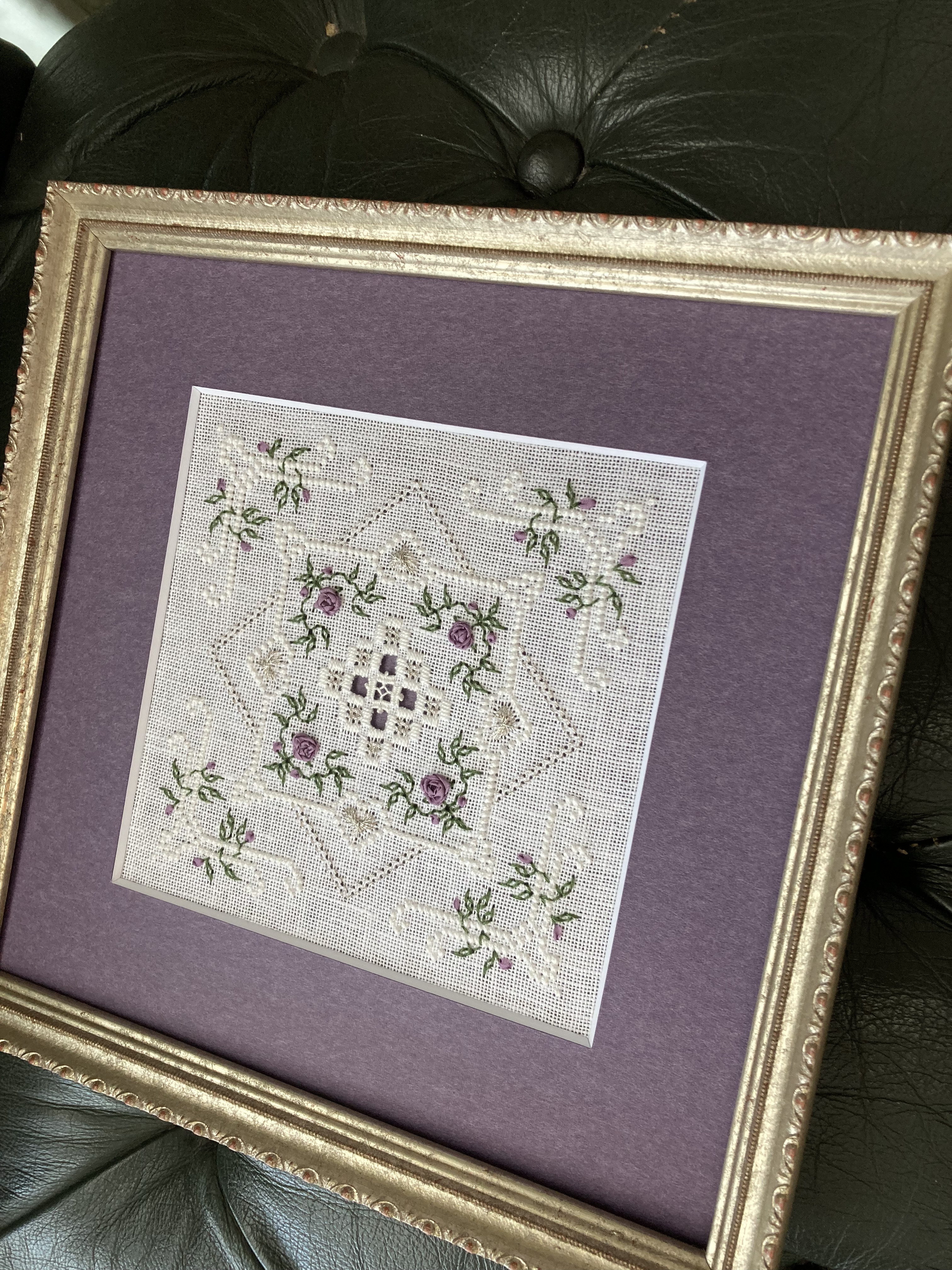 お手持ちの紫のリボンをお使いになりフレームのマットも同色にしたら
